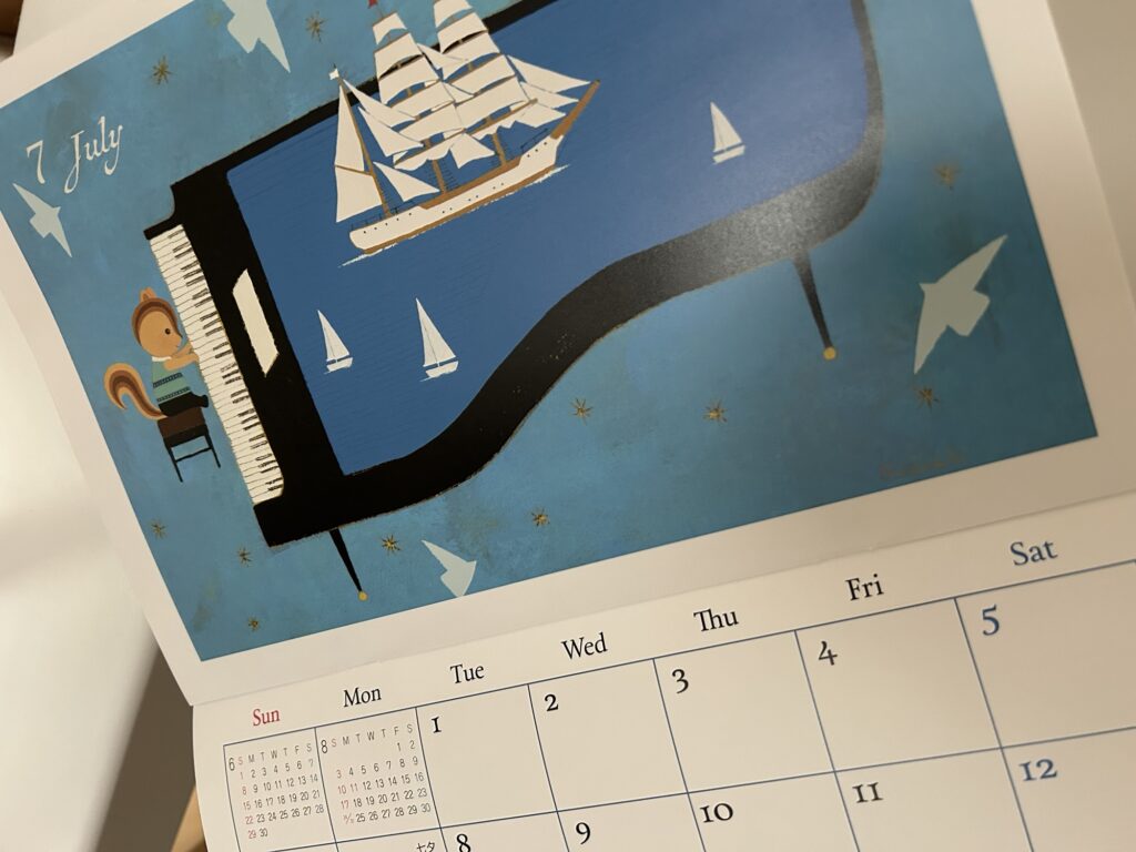 もう、明日は8月なので、このカレンダーもめくらなくてはいけません。でも、ピアノの海、空のブルー、ヨット、カモメの白、7月のこのイラストが涼しげで好きです。