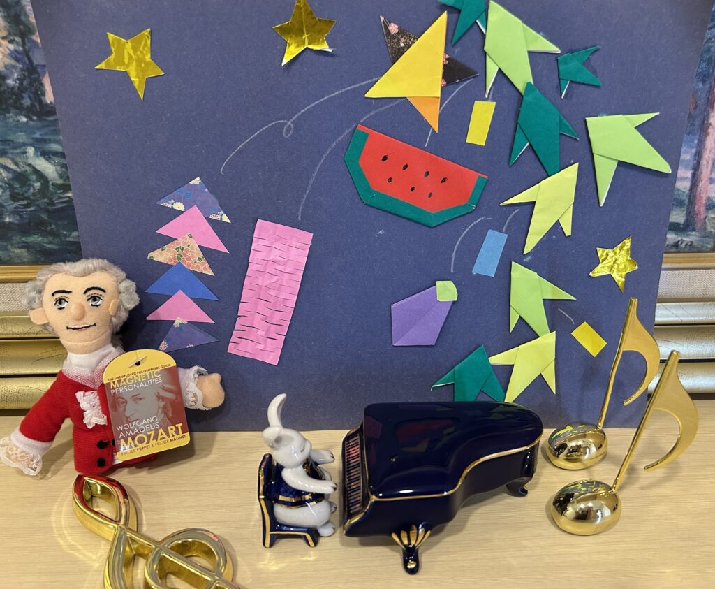 教室の玄関、何年か前に作成した七夕さまの飾りをバックにモーツァルトさんとピアノ♪ きらきら星変奏曲を弾くラビットくんというイメージにしました。