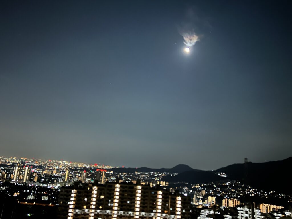 今晩は織姫と彦星は1年ぶりかに会っていることでしょう。気になって、外に出て、夜空を見ました。きれいなお月様も出ています。夜景もきれいでしょ…(こちらは、自宅第1教室より撮影しています)