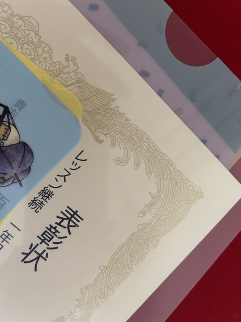 写真の可愛い「だいすきドレミ」のイラストのクリアファイル中には、その表彰状が入っています。